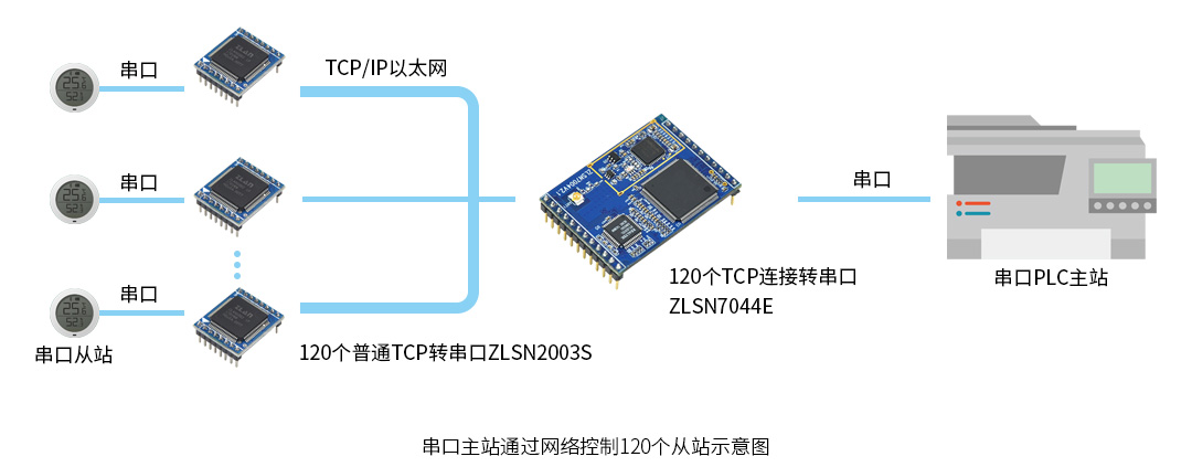 傳統(tǒng)的串口轉(zhuǎn)TCP/IP模塊一般只支持小于10個TCP連接。卓嵐的ZLSN7044E串口轉(zhuǎn)以太網(wǎng)模塊支持120個TCP轉(zhuǎn)UART的連接,ZLSN7046T串口轉(zhuǎn)Wifi模塊支持200個TCP轉(zhuǎn)UART連接。多TCP連接使得主機(jī)可以同時控制超過100個從機(jī),實(shí)現(xiàn)了網(wǎng)絡(luò)可擴(kuò)展的優(yōu)勢。